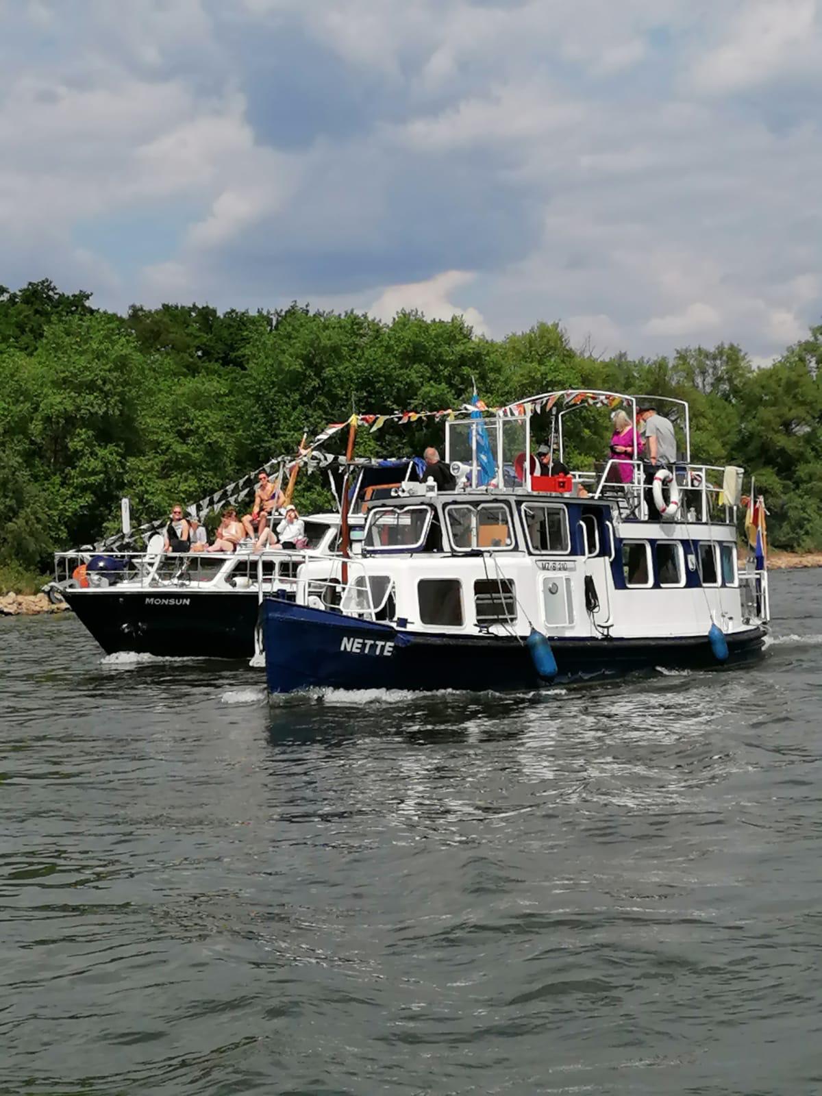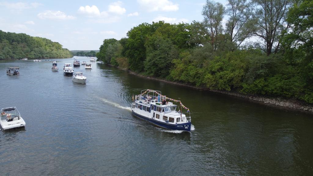 Traditionell legten um 14 Uhr ca. 30 Boote zu Ihrer Ausfahrt um die Mariannenaue ab. Wie immer ging es zu Beginn langsam Richtung Ausgang des Altrheinarmes. Darauf einen Kilometer zu Berg, durch die kleine Gies zu Tal bis zur Mündung der Mariannenaue. Ab dort ging es wieder zu Berg durch die große Gies bis zur Einfahrt des Altrheines und von dort zurück zum Anleger.